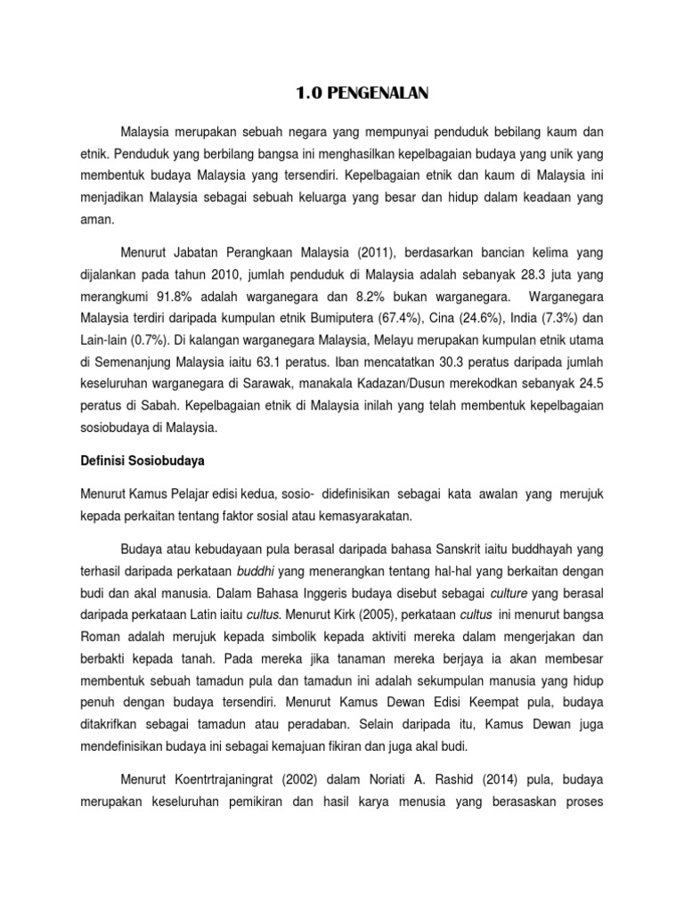 Justeru budaya boleh didefinisikan sebagai suatu cara hidup yang diamalkan oleh kumpulan tertentu dan meliputi sistem sosial. Berkaitan dengan persahabatan pergaulan dan aktiviti masa lapang. Maksud perpaduan menurut kamus dewan.